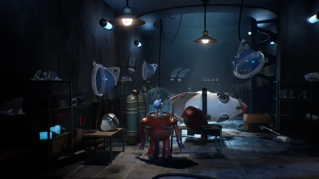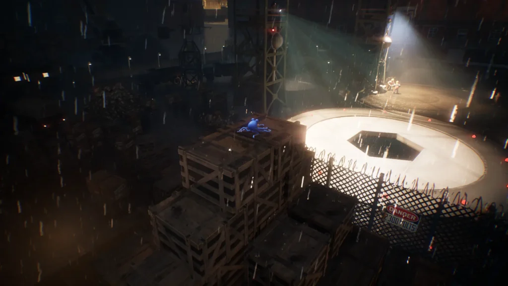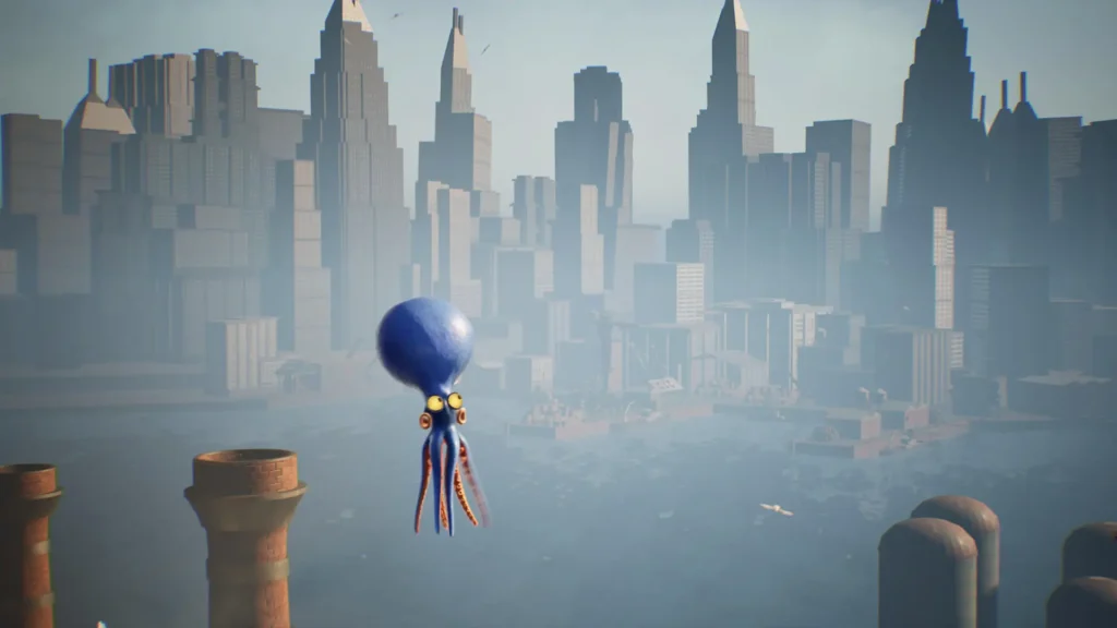 There’s not a lot here we haven’t seen in similar games, but there are enough memorable sequences to make it stick. Darwin’s unique anatomy and cartoon-like relationship to physics will see you slingshot across buildings, goop yourself up with glowing radioactive waste, inflate your head for extra air. At one point you’ll complete a Gladiator-style obstacle course, only to flood the whole thing and have to cross back while using the floating foam pads as cover from searching submarines. You’ll need to suffer a few deaths along the way to solve things by trial and error, sometimes frustratingly up against unclear messaging or rough design, but the level of challenge in the platforming and puzzles ramps up and crescendos nicely as you approach the conclusion after five or so hours.