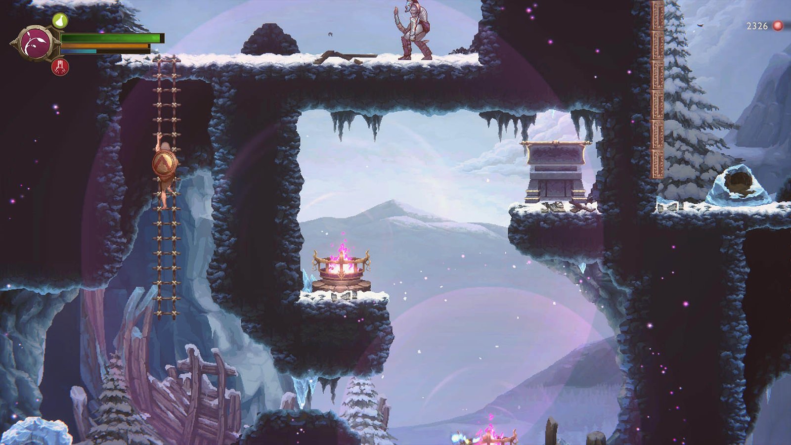 A commendable effort’s been made to retrofit the Greek and Norse God of War progression mechanisms into the metroidvania engine, with coloured orbs that spew from defeated foes and de-lidded chests cycling into their appropriate gauges. Kill a monster conventionally and it’ll bleed red orbs to power your skill trees and gear upgrades, or get fancy with it and you’ll earn green, yellow or blue orbs to fill your health, skill and magic bars, respectively.