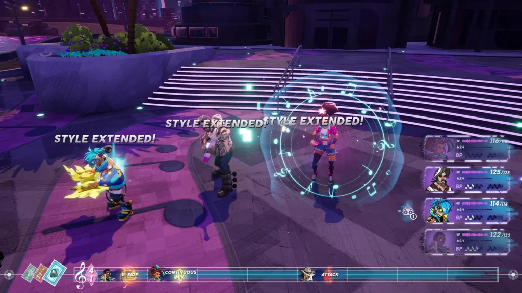 The game’s turn-based combat is similarly tightly-balanced but able to be softened if you don’t resonate with what it’s doing. It’s a very clever system that leans all the way into the musical idea, presenting turns as “stanzas” that are shared by your party and the enemy and can be manipulated to give you more “beats,” change their effectiveness or otherwise go in your favour. Often, a stanza will inherit a particular musical style from a member of your party, which not only neatly changes up the battle music to add their genre flavour but gives them a power advantage, and taking this into account along with your turn order and hitting the rhythm prompts attached to most moves is crucial in succeeding.