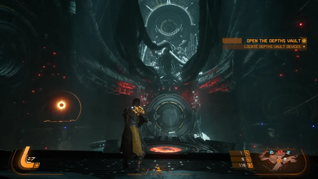 Yellow, though. These are the nasty ones. They can be dashed through, or blocked, but letting them hit either Arjun or his shield adds an increasing amount of ‘corruption’ to his suit, restricting his maximum health and applying further negative effects if left unchecked. These don’t appear by default, with regular enemies usually only employing the other two colours, but everything changes on Carcosa when the Eclipse comes…