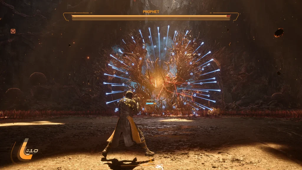 I’ll try my best not to consistently compare the two, but for those who’ve played Returnal, a lot of Saros should feel immediately familiar. The game builds on the visual language established in its spiritual predecessor, adding to the thematic palette of blue and red with a third colour – yellow. There are numerous narrative implications to yellow in Saros, but it’s also a crucial part of survival on Carcosa. It means that the bullet-hell projectiles that define these games now come in three hues, and learning to navigate each one is the only way to get by.